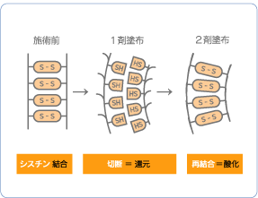 パーマは簡単にいうと還元剤(パーマ1液)により毛髪内部の結合を一度切断してロット(巻きつける棒ね)の形状に毛髪細胞をずらし、ずれた形に酸化剤(パーマ2液)で細胞を再結合する・・・